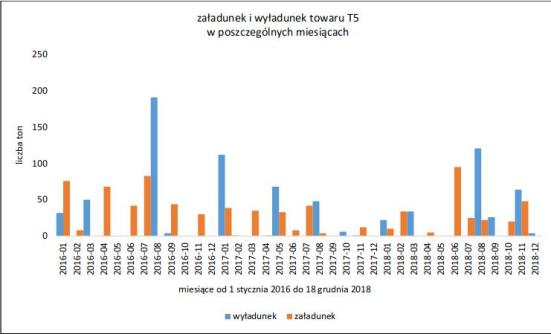 Sporządź wykres kolumnowy przedstawiający, ile załadowano i ile wyładowano towaru T5 w każdym miesiącu od 1 stycznia 2016 r. do 18 grudnia 2018 r. Załadunek i wyładunek dla każdego miesiąca przedstaw w dwóch kolumnach. Pamiętaj o opisaniu obu osi (dla osi poziomej użyj formatu rrrr-mm) i o tytule wykresu.