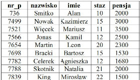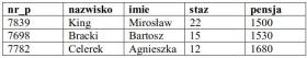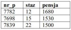 | 3 | Wynikiem zapytania będą wiersze z tabeli pracownicy, zawierające wszystkie dane z tej tabeli dotyczące pracowników, dla których wartość z kolumny pensja jest mniejsza niż 2000, posortowane nierosnąco według parametru staz. | P | F |